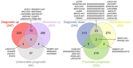 At this point of the analysis, we decided to overlap the final lists for the first three categories to highlight the most interesting lncRNAs in terms of clinical value. We generated two different intersections, as represented in Figure 7: one comparing the upregulated lncRNAs, which represent the ones that would be putative oncogenes, and another one comparing the downregulated lncRNAs, which represent the ones that could be considered tumor suppressors.