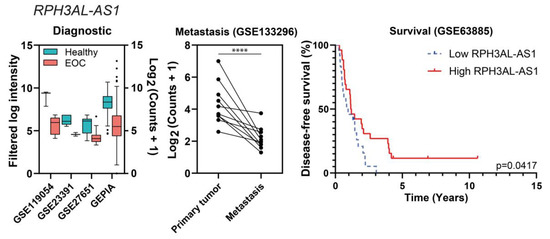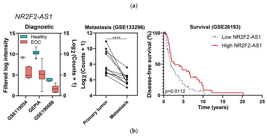 NR2F2-AS1 and RPH3AL-AS1 were both downregulated in EOC in comparison with healthy tissues in four independent studies (NR2F2-AS1 was also downregulated in EOC cell lines) and in one study of metastatic tumors, correlating with a favorable prognosis (specifically, with improved disease-free survival), as shown in Figure 8.