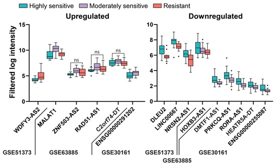Deregulated lncRNAs in tissue from patients according to the sensitivity to standard chemotherapy. All of the comparisons are p < 0.05 except for those indicated with ns, indicating p > 0.05.