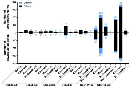 A summary from these 22 analyses is shown in Figure 1, in which the number of up- and downregulated lncRNAs in EOC is depicted, as well as the sum of the other gene biotypes (protein-coding genes, pseudogenes, micro-RNA genes, T-cell receptor genes, immunoglobulin genes, small nuclear RNA genes, small nucleolar RNA genes, small Cajal body-specific RNA genes, ribosomal RNA genes, and ribozyme genes). The study generating the highest number of deregulated targets was GSE190688, with 6934 up- and 5325 downregulated, of which 1691 and 1497 were lncRNAs, respectively. For GSE29220, statistically significant deregulation was not identified.