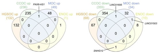 Venn diagrams representing the intersections between the final lists of the upregulated (left) and downregulated (right) subtype-specific lncRNAs. HGSOC, high-grade serous ovarian carcinoma; CCOC, clear cell ovarian carcinoma; MOC, mucinous ovarian carcinoma; ENOC, endometrioid ovarian carcinoma. Diagrams were generated using interactivenn.net.