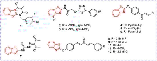 Chemical structure of benzoxazole and benzothiazole antibacterial active compounds 1–12.