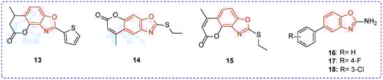 Chemical structure of benzoxazole antifungal active compounds 13–18.