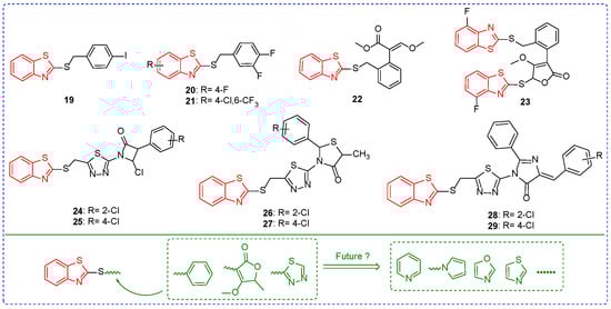The IC50 value of compound 19 (Figure 4) for B. cinerea was 1.4 μM (Table 3), and the addition of methylene between benzothiazole and aryl increased the fungicidal activity of the compound [67]. At a concentration of 50 mg/L, the inhibitory rates of compound 20 against Rhizoctonia solani (R. solani), B. cinerea, Dothiorella gregaria (D. gregaria), and Colletotrichum gossypii (C. gossypii) were 92%, 97%, 89%, and 78%. Moreover, the introduction of chlorine atoms and trifluoromethyl compounds was not beneficial to the fungicidal activity of the compounds. For example, the inhibitory rates of compound 21 against R. solani, B. cinerea, D. gregaria, and C. gossypii were 40%, 67%, 35%, and 37% [68]. The EC90 values of compound 22 on Sphaerotheca fuliginea (S. fuliginea) and Pseudoperoniospora cubensis (P. cubensis) were 6.17 and 46.32 mg/L, respectively [69]. The inhibition rates of compound 23 on S. fuliginea and P. cubensis were 67% [70] because the introduction of large steric groups reduced the fungicidal activity of the compound. Compounds 24, 26, and 28 showed inhibition rates of 69%, 55%, and 65% against Phytophthora infestans (P. infestans) at concentrations of 100 ppm. The fungicidal activities of compounds 24, 26, and 28 were reduced when chlorine atoms on the position-2 of the benzene ring were replaced by position-4 fluorine atoms of the benzene ring. For example, compounds 25, 27, and 29 have inhibition rates against P. infestans of 58%, 53%, and 58% [71].