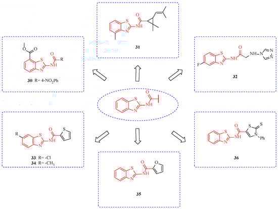 Amide bonds can form hydrogen bonds with target proteins, and compounds obtained by an organic combination of benzothiazole and amide often show good fungicidal activity [72]. At the concentration of 1000 mg/L, compound 30 (Figure 5) showed an inhibition rate of 88.9% (Table 4) against B. cinereal—the 4-nitrophenyl group was beneficial to improve the fungicidal activity of the compound. Interestingly, compound 30 showed better fungicidal activity in vivo than in vitro, suggesting that compound 30 may enhance plant disease resistance [73]. At a concentration of 50 mg/L, the inhibition rates of compound 31 on B. cinerea and Gibberella zeae (G. zeae) were 80% and 75%, respectively, suggesting that the introduction of permethric acid had no significant contribution to the fungicidal activity of the compound [74]. The EC50 values of Compound 32 against Ustilago tritici, Puccinia striiformis, Puccinia triticina, Blumeria graminis, Dickeya oryzae, and Ustilag ohordei are were all less than 0.8 mmol/L [75]. The inhibition rates of compounds 33 and 34 against Helminthosporium maydis were 78.6% and 80.6%. The fungicidal activity of the compound was not significantly improved by the introduction of electron-donating or electron-absorbing groups at position-6 of the benzothiazole ring. This suggests that the fungicidal activity of the compound in this structure is independent of the electron density at position-6 of the benzothiazole ring. In the future, spatial effects, hydrogen bonding, and water transport may be considered [76]. When thiazoles in the structure of compounds 33 and 34 were replaced with oxazoles, the fungicidal activity and broad spectrum of the compounds increased. For example, compound 35 had inhibition rates of 93.8%, 94.1%, 93.4%, 94.6%, and 94.5% against R. solani, B. cinereal, G. zeae, Helminthosporium maydis, and Sclerotinia sclerotiorum (S. sclerotiorum) [77]. Compound 36 showed a certain inhibitory effect on Fusarium oxysporum (F. oxysporum) (MIC 12.5 mg/mL) [78].