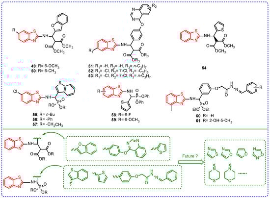 The position-2 of benzothiazoles replaced by thioether is a good fungicidal scaffold structure, which has the value of further optimization and derivation. Currently, the framework is mainly combined with benzene, furanone, and thiadiazole. In the future, it may be considered to introduce thiazole, oxazole, and pyridine on sulfur atoms to optimize the structure.