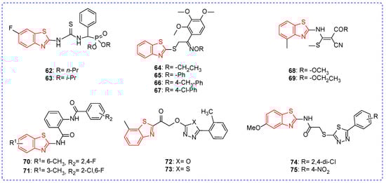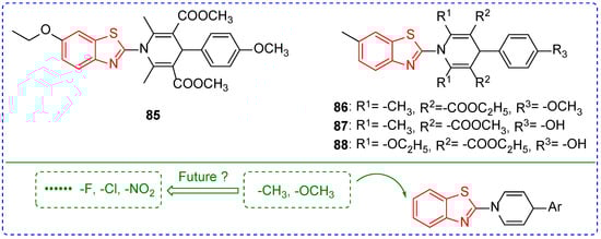 The wide variety of pests is an important factor in crop yield reduction and some pests are characterized by the outbreak, such as Pyrausta nubilalis [119], Helicoverpa armigera [120], Oriental armyworm [121,122], and Locust [123,124,125]. Traditional insecticides have played an irreplaceable role in pest control, and the long-term use of traditional insecticides not only leads to the rapid increase in pest resistance but also pollutes the environment and threatens human health [126,127,128]. The discovery of insecticides has always been a hot topic in pesticide research [129]. However, there are relatively few reports on the insecticidal activity of benzoxazole and benzothiazole, which may be strengthened in the future. The Maximum Likelihood Programmer (MLP) calculation showed that the combination of benzothiazole and pyridine could increase the antifeedant activity of the compounds. For example, LC50 of compounds 85–88 (Figure 10) against Spodoptera litura were 0.38, 0.24, 0.10, and 0.07, respectively [130,131]. The insecticidal activity of compounds 86, 87, and 88 was significantly higher than that of compound 85, which may be due to the different electronegativity of groups introduced at position-6 of benzothiazole. Perhaps this is a hint that we can try to introduce strong electron-absorbing groups such as nitro and trifluoromethyl to benzothiazole in the future to find new insecticides.