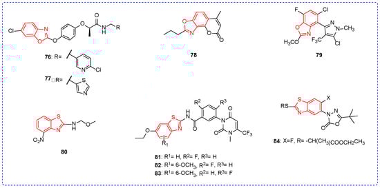 Chemical structures analysis of benzoxazole and benzothiazole herbicidal active compounds 76–84.