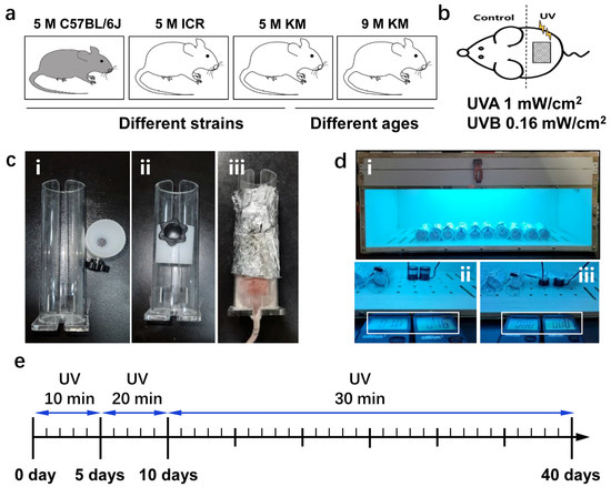 The mice were fed adaptively for one week after purchase. After the adaptation period, three mice from each group were randomly selected and divided into 5-month-old C57BL/6J, 5-month-old ICR, 5-month-old KM, and 9-month-old KM groups. The day before UV exposure began, the back hair of the mice was removed using a mild hair removal cream. In the course of 40 consecutive days of irradiation, hair removal was performed according to the hair growth of the mice, and the frequency was once every 5–7 days. In order to avoid any influence of hair removal on ultraviolet irradiation, we would irradiate the mice 12 h after hair removal. The lower back of the mice was the UV-irradiated part (the exposed skin area was approximately 0.21 × 0.13 cm), the upper back was the non-irradiated part, and the photographing position was marked with a marker pen.