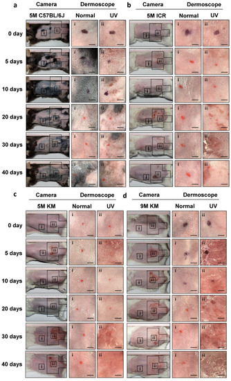 The back skin of the mice at days 0, 5, 10, 20, 30, and 40 was recorded using a camera and dermoscope to observe the skin changes during the process of chronic photoaging. The unirradiated part of the three different species of mouse was smooth, with no obvious redness or desquamation (Figure 2a–c). The irradiated skin of the 5-month-old ICR mice showed typical characteristics of chronic photoaged skin, such as obvious thickening, leathery skin, redness, and desquamation. The irradiated skin of the 5-month-old KM mice showed more obvious photoaging features, such as thickening, leathery skin, swelling, and desquamation. The irradiated skin of the C57BL/6J mice showed desquamation on day 5, and mainly showed pigmentation on days 10–40; other photoaging characteristics were not obvious. The results of the general skin observations suggested that 5-month-old ICR and KM mice are suitable for studies on epidermal morphological changes in chronic photoaging skin, while C57BL/6J mice are suitable for studies on changes related to chronic photoaging pigmentation. To investigate whether the skin of KM mice of different ages showed differences in the process of chronic photoaging, the skin of 9-month-old KM mice was included (Figure 2d). It was found that skin photoaging in the irradiation site of 9-month-old KM mice was more obvious than that of 5-month-old KM mice.