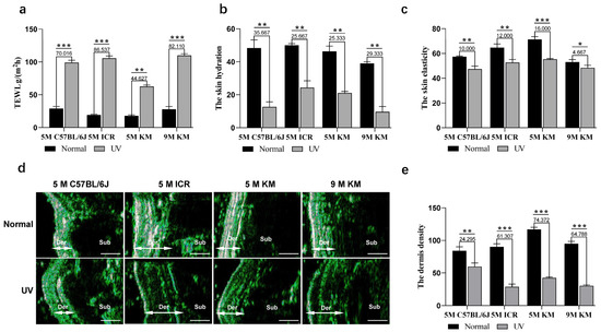 Physiological changes of the skin in chronic photoaged mice. On the 40th day, the changes in the skin physiology of the control and chronic photoaged skin of the mice were observed. (a) Skin barrier function was detected by percutaneous water loss (TEWL). (b) Epidermal hydration, (c) skin elasticity, and (d) dermal density were detected using skin ultrasound. (e) Quantitative statistics of dermal density were detected using skin ultrasound. The numbers above the bars indicate the specific difference between the UV irradiated sites compared to the control group. * p < 0.05, ** p < 0.01, *** p < 0.001. TEWL, skin percutaneous water loss; Der, dermis; Sub, subcutaneous tissue; 5 M, 5-month-old; 9 M, 9-month-old, Scale bar: 1 mm.