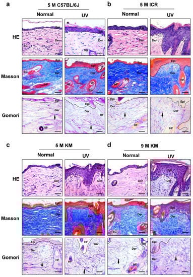 Histological changes of the skin in chronic photoaged mice. On the 40th day, the histological changes in the control and chronic photoaged skin of the mice were observed. (a) 5-month-old C57BL/6J mice, (b) 5-month-old ICR mice, (c) 5-month-old KM mice, and (d) 9-month-old KM mice. The black arrow indicates elastic fibers; HE, Hematoxylin and eosin staining; UV, ultraviolet; Epi, epidermis; Der, dermis; SG, sebaceous gland; HF, hair follicle; 5 M, 5-month-old; 9 M, 9-month-old; Scale bar: 50 μm.