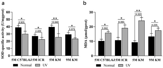Oxidative stress is one of the mechanisms that underlie chronic photoaging [22]. Superoxide dismutase (SOD) is an important antioxidant enzyme that removes superoxide anion free radicals, which can protect cells from damage caused by oxygen free radicals. Malondialdehyde (MDA) is an end product formed by the reaction between lipids and oxygen free radicals. UV radiation can induce the production of a large amount of reactive oxygen species, wherein SOD is greatly consumed and MDA accumulates; therefore, the oxidative stress process can be evaluated via SOD and MDA. After the chronic photoaging process, the level of SOD was significantly decreased after UV irradiation, with the most obvious change in 5-month-old KM mice, followed by 5-month-old C57BL/6J mice, while the decrease in SOD levels in 5-month-old ICR mice was not significant (Figure 6a). The level of MDA (Figure 6b) increased after UV irradiation, with the most obvious change in 5-month-old KM mice, followed by 5-month-old ICR mice, and the smallest change found in C57BL/6J mice. In KM mice of different ages, the oxidative stress level of 5-month-old KM mice was more obvious. The basal SOD value of 9-month-old mice was lower than that of 5-month-old mice, while the basal MDA value was higher than that of 5-month-old mice, indicating that oxidative stress levels are affected by natural aging.