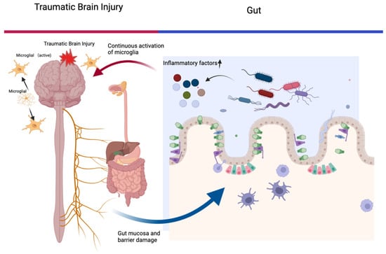 The Microbiota–gut–brain axis denotes a bidirectional conduit crucial for both CNS and gastrointestinal equilibrium, exerting regulatory influence over a host of functions including gut motility, neurobehavior, visceral pain, and intestinal barrier function []. Data from animal models suggest that TBI leads to increased mucosal permeability, which can be observed microscopically within hours after TBI, including oedema, shortening of villi, epithelial shedding and inflammatory inflammation []. In the context of TBI, this axis (Figure 1) might operate via several mechanisms: primary mechanical injury induces direct microglial activation, while neurotrauma incurs damage to the intestinal mucosa and barrier, provoking alterations in intestinal flora structure and augmenting intestinal permeability. The latter may incite a systemic immune response, where peripheral pro-inflammatory factors stimulate primary injury to the CNS, leading to sustained microglial activation, and potentially exacerbating or inciting chronic neuroinflammation. However, the precise role of shifts in the structure and functionality of the intestinal flora remains to be fully understood [].