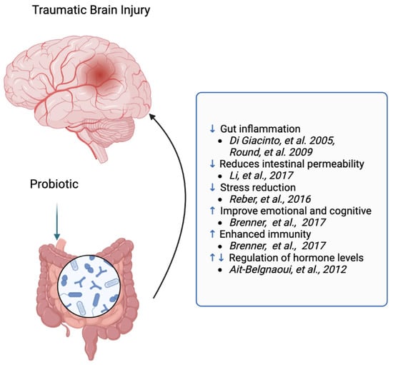 The role of probiotics in traumatic brain injury. ↑: increase;↓: decrease. [,,,,,].