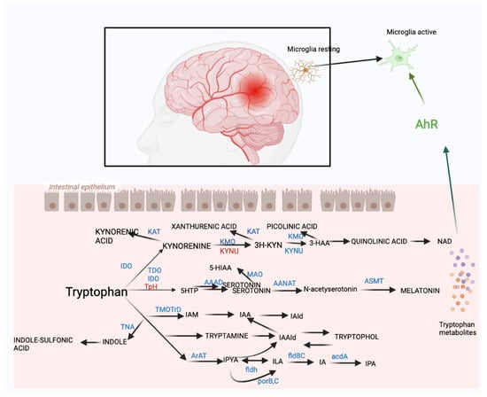 Tryptophan metabolites can exert influence on neurological function through AhR. Research indicates that the intestinal microbiota utilizes the messenger role of tryptophan metabolites and SCFA to primarily regulate neural function via AhR [,]. Tryptophan metabolites produced by the intestinal flora interact with host cells to activate AhR [,]. AhR proteins, which are known to be abundantly expressed in vascular tissue, play a role in neurological disorders []. Predominant tryptophan metabolites generated by the microbiota include indole derivatives, for example indole-3-pyruvate, IAAId, leading to the production of KYN metabolites, many of which act as AhR signal activators. This plays a critical role in post-TBI neurological immunity regulation.