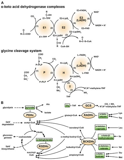 Reaction mechanisms and physiological functions of the hLADH-bearing multienzyme complexes. (A) Structural reaction schemes of the hLADH-bearing complexes. The α-keto acid dehydrogenase enzyme complexes and the glycine cleavage system (GCS) oxidatively decarboxylate their specific substrates in five consecutive steps (1–5) using several cofactors (TPP—thiamine pyrophosphate/diphosphate; LipS2/Lip(SH)2—oxidized/reduced lipoamide; FAD/FADH2—oxidized/fully reduced flavin adenine dinucleotide; CoA—Coenzyme A; NAD+/NADH—oxidized/reduced nicotinamide adenine dinucleotide; PLP—pyridoxal phosphate; THF—tetrahydrofolic acid). (B) Metabolic roles of the hLADH-bearing multienzyme complexes. Metabolic steps are indicated by arrows (double-headed arrows indicate multi-step transformations, whereas bidirectional arrows indicate reversible reactions).