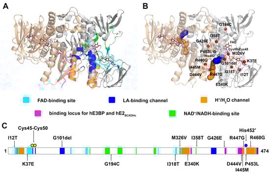 Pathogenic mutations in the hLADH-coding DLD gene lead to LADH/E3 deficiency. Thirteen amino acid substitutions and one deletion have been described, as of today, that affect different functional regions in the hLADH, including the following: the active site or the lipoate-binding channel (G101del and P453L), the FAD-binding site (I12T and K37E), the NAD+/NADH-co-substrate binding site (G194C, I318T, M326V and I358T) and the dimer interface (E340K, G426E, D444V, I445M, R447G and R460G) (Figure 2B,C). These clinically relevant disease-causing variants displayed reduced availability (stability and/or tendency to complex with the other subunits) and/or impaired catalytic activity relative to the wild-type hLADH resulting in dysfunctional multienzyme complexes, which accounts for the development of severe neurological and/or cardiological symptoms, (usually episodic) life-threatening metabolic decompensation, and often premature death [,,]. Selected mutants (P453L, G194C, E340K and D444V) were reported to augment the reactive oxygen species (ROS)-generating activity of hLADH []. ROS production was more significant under a mild acidic condition [,], a common clinical feature in LADH deficiency, since lactic acidosis may frequently develop as a consequence of impaired hPDHc activity.