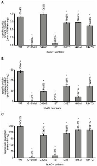 The specific (forward and reverse) catalytic activities of hLADH were compromised to various degrees by the pathogenic amino acid substitutions studied (G101del, I12T, I318T, G426E, I445M, and R447G), as expected. Similarly to those of another set of disease-causing hLADH variants [], the residual LADH activities did not correlate well with the localization of the mutation sites. The studied mutations generally induced more significant losses in the LADH activity in the reverse catalytic direction. Among the pathogenic hLADH mutants investigated here, there were none that could stimulate excess ROS formation compared to reference; in an earlier investigation, four pathogenic hLADH variants (D444V-, P453L-, E340K- and G194C-hLADH) exhibited enhanced ROS-forming capacities, under identical experimental conditions [].