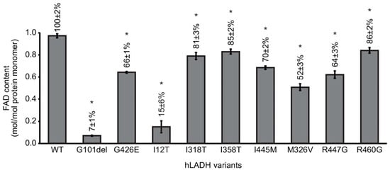 FAD loss in selected hLADH variants. FAD contents in the hLADH mutants were determined via spectrophotometry at 455 nm; FAD was first liberated from the protein-bound state via heat denaturation. FAD content is expressed relative to that of hLADH (100%: 1 mol FAD/1 mol protein monomer). Error bars indicate the S.E.M. All the differences are statistically significant (p < 0.05, denoted by *).