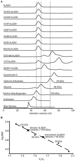 Calibrated size exclusion (FPLC) chromatography (cSEC) analysis of selected disease-causing hLADH variants. (A) The analytical chromatographic elution profiles of the investigated hLADH mutants, in comparison with those of hLADH and molecular weight (MW) reference proteins (from Sigma-Aldrich), represented via arbitrary peak intensities as a function of retention/elution volume (denoted as Ve in panel (B)); peak intensities in the individual chromatographic traces were normalized for better representation. The retention volume of Blue Dextran determined the void volume of the chromatography column (denoted as Vo in panel (B)). The other reference proteins assigned molecular weight ranges on the column. Single dominant chromatography peaks were present in the 66–150 kDa MW range (referenced by albumin and alcohol dehydrogenase, respectively, and illustrated by vertical straight grey lines) for most hLADH variants studied, except for I12T-, M326V- and G101del-hLADH (see text); the approximate MW of the dimeric hLADH is 100 kDa. The 29–66 kDa MW range (referenced by carbonic anhydrase and albumin, respectively) is also marked (by again another straight vertical line) to reveal potential pathogenic dissociation of the obligate hLADH homodimer (relevant here to G101del- and M326V-hLADH variants, with expected MWs of ~50 kDa). (B) The logMW-Ve/Vo calibration curve, which is theoretically expected to be linear, could successfully be orchestrated via transforming data from panel A. Values for the applied protein references are denoted by black filled circles, with the added designation of the MW values of potential interest and crosses label the apparently dimeric hLADH variants, whereas black diamonds designate the two putatively monomeric hLADH mutants; theoretical MWs were calculated at https://web.expasy.org/compute_pi/ (accessed on 18 August 2021). Further experimental conditions are detailed in Section 4.