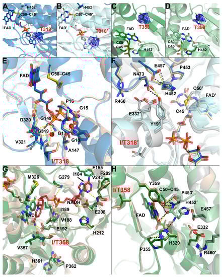 Crystal structures of the I318T- and I358T-hLADH variants. (A–D) (2mFo-DFc) Composite omit maps contoured at 1.0σ are shown as blue meshes around the substituted residues in chain A (A) and B (B) of I318T-hLADH, as well as in chain A (C) and B (D) of I358T-hLADH. The two chains in I318T- and I358T-hLADH are colored with two shades of blue and green, respectively. The FAD prosthetic group, the active site disulfide bridge (Cys45–Cys50) and the catalytic base (His452′) are all depicted as sticks. (E,F) Aligned structures of I318T-hLADH and hLADH (PDB ID: 6I4Q) are shown for part of the FAD binding site (E) and the active site (F). Structural water molecules are shown as red spheres. Selected H-bonds (see text) are displayed as dashed lines; H-bonds are not shown for the mutant structure in panel (E), since water molecules could not be modeled there. (G,H) Aligned structures of I358T-hLADH and hLADH (PDB ID: 1ZMD in panel (G), PDB ID: 6I4Q in panel (H)) are displayed for the NAD+/NADH-binding site (G) and the active site (H). The arrow points to the side chain of residue I184 behind the FAD. Monomers A and B in hLADH are beige and grey, respectively, in panels (E–H).