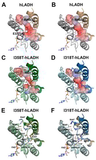 The I318T substitution altered the specific LADH activities in both catalytic directions (79 and 51% residual activities in the forward and reverse directions, respectively) and induced less than 20% FAD loss in the recombinant enzyme, even though the residue Ile318 resides in the FAD-binding region in hLADH. This residue in hLADH is involved in the formation of a β-sheet structure that interacts with the FAD at several points (mostly at the β-turn segments) and is also proximal to the entrance of the NAD+/NADH-binding pocket and residues that directly participate in NAD+/NADH binding (Met326, among others). The residue Ile318 itself coordinates a H2O molecule through its carbonyl oxygen (along with Val321(N) and Gly149(N)), which in turn interacts with one of the phosphates in FAD (Figure 6E). In all the crystal structures of hLADH and its pathogenic mutants hitherto studied, two such H2O molecules could always be modeled on the two sides of this same phosphate; hence, those may well be conserved (Figure 6E). Thus, the residue Ile318 likely plays a role in FAD coordination in hLADH. However, the crystal structure of I318T-hLADH revealed no significant structural alterations throughout the structure that support our biochemical/functional results, at least in the forward (physiologically more relevant) direction. In the mutant structure, H2O molecules could hardly be modeled (due likely to the high B-factors), even in the highly conserved positions near the FAD; therefore, no conclusions could be drawn regarding the effects of the substitution on the above detailed H2O-mediated interaction with the FAD. The substitution triggered only minor displacements in the main chain of the directly affected peptide segment (Ile315-Val321) (Figure S2); therefore, the above-mentioned key interaction with a water molecule cannot completely be ruled out. In the active site, minor dislocations of the His452 and Glu457 side chains could be observed (Figure 6F). As a result, these two side chains moved apart by a fraction of an angstrom, perhaps also weakening their otherwise crucial interaction. Alternative conformations for amino acid side chains could not be modeled because of the relatively low resolution; the residues Glu332 and Arg460’ were no exceptions. The Glu332 side chain appeared to become extended towards the active site (Figure 7D,F); however, the slightly blurred density did not exclude the flexibility of the side chain, either. If we assume a dominant conformation, which extends towards the active site, then that may indeed be capable of perturbing the polarity and geometry of the active site (Figure 7D,F) and eventually LA binding. The Arg460 side chain is in a conformation that potentially permits the formation of a H+/H2O channel of a larger diameter.