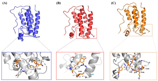 BRD shares a highly conserved structure consisting of four left-handed bundles of α-helices (αZ, αA, αB, αC) connected by flexible loop regions called ZA loop and BC loop, which are variable in sequence and form acetyl binding sites [20]. Similar in structure to the Bromodomain-Containing family proteins, the BRD4 protein consists of four α-helices (A, B, C, and Z), two loops (ZA and BC), a ZA channel, WPF pocket, and a cavity between four α-helices. BRD4 uses these cavities to mediate histone recognition [20]. Figure 1A–C show the hydrogen bonds between the inhibitor MS436, the allosteric inhibitor ZL0590, the two inhibitors, and BRD4. There were four hydrogen bonds between BRD4 (Q85, Y97, N140) and MS436 and two hydrogen bonds between BRD4 (Y95, P100) and ZL0590. After using molecular docking to bind both inhibitors, there was one hydrogen bond between BRD4 (C96) and MS436 and six hydrogen bonds between BRD4 (Y95, I96, N98, K99, P100, G101) and ZL0590. The more hydrogen bonds there are between complexes, the more stable they are.