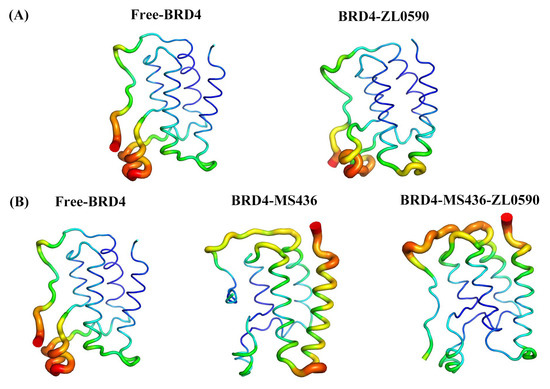 (A) The B-factors diagrams of Free-BRD4 and BRD4-ZL0590. (B) The B-factors diagrams of Free-BRD4, BRD4-MS436, and BRD4-MS436-ZL0590.