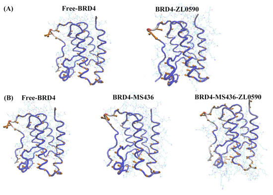 In order to explore the mechanism of allosteric sites, we designed four different systems, which were divided into two groups for analysis, namely, Free-BRD4, BRD4-ZL0590, and Free-BRD4, BRD4-MS436, BRd4-MS466-ZL0590. The 3D structures of BRD4-MS436 (PDB code: 4NUD) [42] and BRD4-ZL0590 (PDB code: 6u0d) [18] were obtained from the protein database (www.rcsb.org, accessed on 2 August 2022). The water and ligand in the protein were removed by Discovery Studio [45], and Free empty protein Free-BRD4 was obtained.