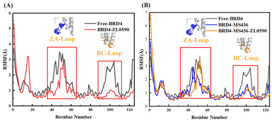 Figure 4A,B show the value of B-factor during MD simulation. B-factor reflects the protein’s flexibility. The higher the B-factor in the protein structure, the better the protein mobility. As can be seen from Figure 4, in the MD process, the binding of MS436 reduced the B-factor near the active site, while the simultaneous binding of MS436 and ZL0590 inhibitors reduced the B-factor of the entire BC loop and ZA loop domain, and the active region of BRD4 experienced the weakest flexibility and the greatest stability.