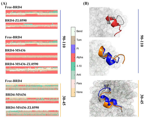 (A) The secondary structure changes’ probability of Free-BRD4 and BRD4-ZL0590, BRD4-MS436 and BRD4-MS436-ZL0590 in residues 90–110 and 30–45. (B) The 3D structure changes in the four systems.