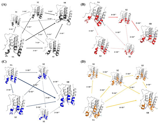 Observing this flux result, it can be seen that the most representative conformational transition pathways were SA→SB and SA→S3→SB, accounting for 59.17% and 29.59% of the total flux, respectively.