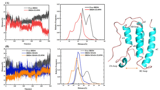 (A) The distance between BC loop and ZA loop of Free-BRD4 and BRD4-ZL0590. (B) The distance between BC loop and ZA loop of Free-BRD4, BRD4-MS436, and BRD4-MS436-ZL0590.