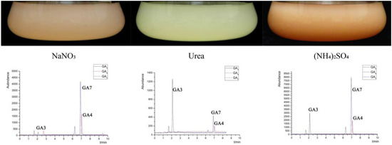 FsCNO-1 strains displayed variation in pigmentation three days after inoculation with different nitrogen treatments (Figure 1). We investigated the ability of the FsCNO-1 to produce gibberellins (GA7, GA3, and GA4 were the main gibberellins). GA7 and GA4 accumulated up to 10,000 and 6000 µg/L after culturing for three days in (NH4)2SO4 and NaNO3 culture conditions. Meanwhile, cultures grown with urea had GA7 and GA4 levels at 600 µg/L. GA3 produced about 3-fold more than GA4 and GA7 when cultured in the urea, whereas GA7 was approximately 2.0-fold more than what GA3 produced when cultured in (NH4)2SO4 (Figure 1).