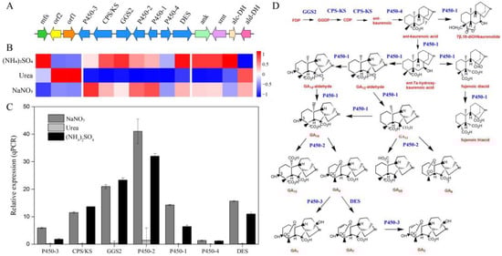 Noticeably, growth in media having urea as the nitrogen source completely repressed the expression of the GA cluster core genes, which had an overall effect of decreasing the pool of GA cluster transcripts, limiting GA metabolic flux. In particular, genes encoding cytochrome P450 monooxygenase (P450-3), geranylgeranyl diphosphate synthase (GGS2), and/or ent-copalyl diphosphate/ent-kaurene synthase (CPS/KS), cytochrome P450 monooxygenase (P450-2), GA14-synthase (P450-1), and GA4 desaturase (DES) showed significantly higher transcript levels on either (NH4)2SO4 or NaNO3, as compared to urea. In addition, several intermediates and final biosynthetic steps are catalyzed by P450-2 and DES (Figure 2D) [14]. Although the P450-3 gene expression was accompanied by relatively high levels of GA3 production in (NH4)2SO4 media, only low production levels were seen for growth on NaNO3. Our results show that the total GA production largely corresponded with the gene expression levels. Six out of seven GA genes in FsCNO-1 were regulated by nitrogen, except for ent-kaurene oxidase (P450-4), which showed only faint expression and remained low (fold change < 1.0) regardless of the nitrogen source. However, the expression levels of seven GA-flanking genes were highly variable (Figure 2B). Genes flanking the GA cluster are often regulated by a transcriptional regulator in the cluster itself that could co-regulate the transcription of cluster genes [15]. However, our data could not define how the expression of GA-flanking genes is affected by the nitrogen source or whether these genes coordinate the expression of GA cluster genes during GA synthesis in response to specific nitrogen signals.