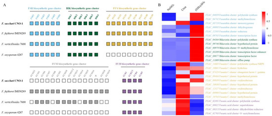 Nitrogen influences the expression of mycotoxin biosynthesis genes in FsCNO-1. (A) Comparison of FSR, BIK, FUS, FUM, and FUB biosynthetic gene clusters between four Fusarium species. (B) Heatmap clustering of the gene expression profiles of core enzyme genes associated with mycotoxin biosynthesis. Note: FSR—fusarubin, BIK—bikaverin, FUS—fusarin C, FUM—fumonisin, FUB—fusaric acid, and Ψ indicates the pseudogene. The white box represent no detected cluster genes.