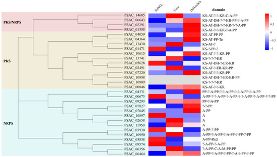 PKS/NRPS. Sixteen putative PKS genes, fourteen NRPS genes, and four PKS-NRPS hybrid genes were identified in FsCNO-1 (Table S2). A prediction tool identified a complete set of conserved domains comprising each PKS or NRPS gene (Figure 4). Based on Clustal W v2.0 and MEGA v7.0 software, a phylogenetic tree of the PKSs and NRPSs protein sequences was performed using the neighbor-joining (NJ) method. In addition, in the expression of PKSs and NRPS genes, significant variation was detected for the FsCNO-1 transcriptome. Only two putative PKS genes (FSAC_10998 and FSAC_10909) were silent and could not express, and the other twenty-eight genes showed distinctly different expression patterns for growth on different nitrogen sources (Figure 4).