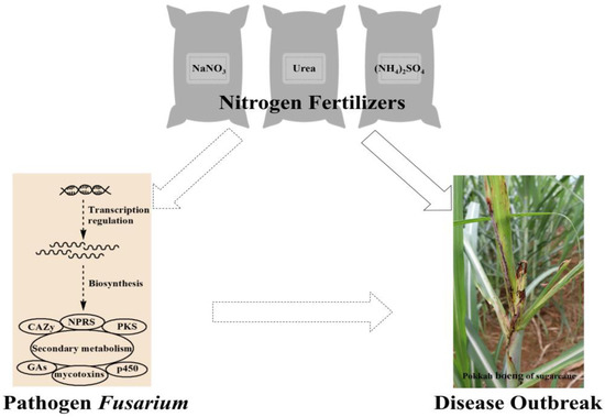 The critical factors affecting fungal growth are nitrogen sources that affect the growth and synthesis of secondary metabolites, including mycotoxins. Nitrogen commonly limits plant growth in terrestrial ecosystems and affects competitive interactions within plant-microbe communities, including pathogen and symbiotic microorganisms [1]. Although nitrogen fertilizers improve the nutrient status of plant hosts, they can also promote disease by affecting physiological and biochemical balances in plants [2,3]. However, the overuse of nitrogen fertilizers and the inadequate timing of fertilizer application can promote plant disease outbreaks [4].
