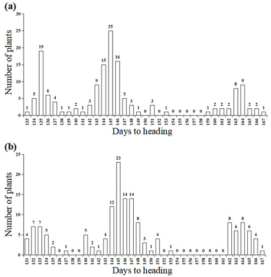 Frequency distribution of days to heading in the segregation population from WJN3141 (a) and WJN3151 (b).
