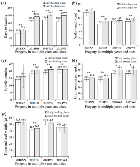 The trait values of stable progeny in multiple years and sites. (a) Days to heading of stable progeny in multiple years and sites; (b) Spike length (cm) of stable progeny in multiple years and sites; (c) Spikelet number of stable progeny in multiple years and sites; (d) Grain number per spike of stable progeny in multiple years and sites; (e) Thousand seed weight (g) of stable progeny in multiple years and sites. * and ** on the histogram suggest significance of the t test at p < 0.05 and p < 0.01, respectively.