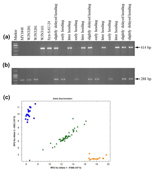 In the promoter region, if the amplification using primers Ppd-D1_F and Ppd-D1_R1 produced a 414 or 453 bp band, the variety carried the recessive day-length sensitive allele ppd-D1b, a 288 bp fragment was amplified using primers Ppd-D1_F and Ppd-D1_R2, and the variety carried the dominant insensitive allele Ppd-D1a [15]. Using the Ppd-D1_F and Ppd-D1_R1 primers, Syn-SAU-24 and WJN3161 (later heading date) amplified a 414 bp fragment, which differed from those produced by WJN3201 (early heading date) with no amplicon (Figure 5a). Meanwhile, using the Ppd-D1_F and Ppd-D1_R2 primers, WJN3201 (early heading date) amplified a 288 bp fragment, which differed from those produced by Syn-SAU-24 and WJN3161 (later heading date) with no amplicon (Figure 5b). Further analysis of two F7 segregation populations from WJN3141 and WJN3151 revealed early heading plants, slightly delayed heading plants, and later heading plants, which amplified a no amplicon, 414 bp fragment, and a 414 bp fragment by the primers Ppd-D1_F and Ppd-D1_R1, respectively (Figure 5a). Moreover, early heading plants, slightly delayed heading plants, and later heading plants amplified a 288 bp fragment, a 288 bp fragment, and a no amplicon by the primers Ppd-D1_F and Ppd-D1_R2, respectively (Figure 5b). Using the developed KASP markers, Syn-SAU-24 and early heading plants carried homozygous intact exon 7, while later heading plants carried the homozygous 5 bp deletion in exon 7, and slightly delayed heading plants carried the heterozygous genotype in exon 7 (Figure 5c). The summary of all molecular analysis and the genotypes of plant materials are shown in Table 3. Resequencing of the PPD-D1 gene showed that PPD-D1 of Syn-SAU-24 (accession no. MZ821039) indeed carried intact exon 7.