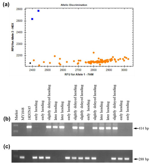 All plants from the F2 and F2:3 populations for genetic analysis of the association of the 2 kb insertion with later heading had a 5 bp deletion in exon 7 (Figure 7a). Using the 2 kb deletion markers for further analysis, early heading homozygotes had no band and 288 bp fragment in two polymorphic sites, while later heading homozygotes had 414 bp amplification and no amplification in two polymorphic sites (Figure 7b,c). Meanwhile, heterozygotes had 414 bp amplification and 288 bp amplification in two polymorphic sites (Figure 7b,c). These findings confirmed that the 2 kb insertion was associated with delays in heading.