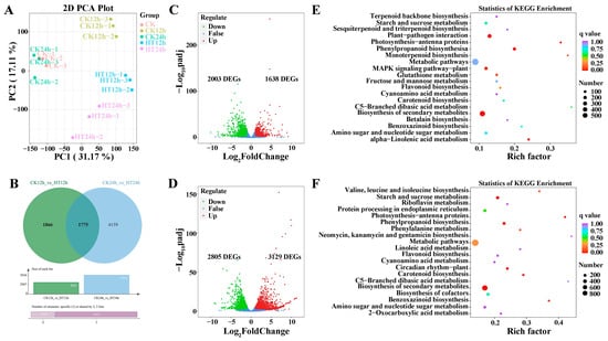 Transcriptome analysis for sweet corn in response to heat stress. PCA analysis among different time points under heat stress (A). Veen diagram between two groups at 12 h and 24 h under heat stress (B). Volcano plot shows DEGs with the conditions |Log2FC| ≥ 1 and FDR < 0.05 under heat stress at 12 h (C) and 24 h (D) under heat stress. KEGG enrichment analysis for sweet corn after 12 h (E) and 24 h (F) under heat stress.