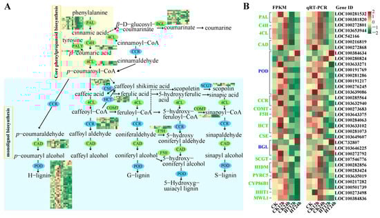 This study investigated the processes of phenylpropanoid biosynthesis and phenylpropanoid metabolism, with 102 DEGs encoding 20 kinds of bio-enzymes (Figure 2A and Table S5). After 24 h of heat stress, the genes encoding enzymes in the core phenylpropanoid biosynthesis pathway were all inhibited, including PAL (phenylalanine ammonia-lyase, ten genes), C4H (cinnamic acid 4-hydroxylase, three genes), and 4CL (4-coumarate-CoA ligase, three genes). In addition, genes encoding cinnamyl alcohol dehydrogenase (CAD, six genes, down-regulated), peroxidase (PER/POD, 33 genes, five up-regulated, 28 down-regulated), cinnamoyl-CoA reductase (CCR, eight genes, four up-regulated, four down-regulated), trans-caffeoyl-CoA 3-O-methyltransferase (COMT, two genes, down-regulated), ferulate-5-hydroxylase (F5H, two genes, down-regulated), cytochrome P450 98A1 (CYP98A, one gene, down-regulated), and putrescine hydroxycinnamoyl transferase/hydroxycinnamoyl transferase-encoding genes (PHT/HCT, six genes, one up-regulated, five down-regulated), as well as caffeoyl shikimate esterase (CSE, five genes, one up-regulated, four down-regulated), which are directly involved in the monolignol biosynthesis, were mostly down-regulated.
