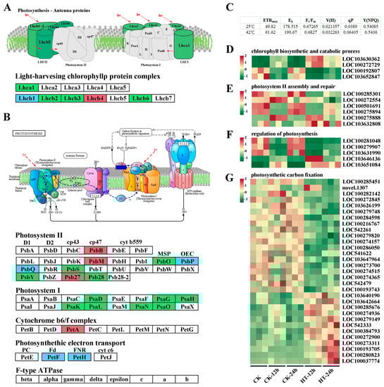 DEGs involved in the photosynthesis process in response to heat stress. Diagram of DEGs in photosynthesis–antenna proteins and photosynthesis process under heat stress. Red, green, and blue boxes represent up-, down-, and both up- and down-regulated gene expression, respectively (A,B). Index values after 24 h recovery for 12 and 24 h heat treatment seedlings (C). Heatmap of genes related to chlorophyll biosynthetic and catabolic (D), photosystem II assembly and repair (E), regulation of photosynthesis (F), and photosynthetic carbon fixation (G). ETRmax, maximum electron transport rate; EK, saturating irradiance; Fv/Fm, maximum photosynthetic rate; Y(II), actual photosynthetic rate; qP, photochemical quenching coefficient; and Y(NPQ), quantum yield of regulatory energy dissipation.