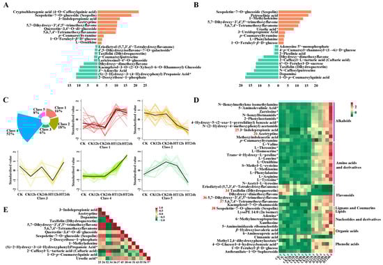 Metabolomic profiles of sweet corn seedlings under heat stress. Top 20 metabolites detected under heat stress after 12 h (A) and 24 h (B). Orange bars stand for up-regulated compounds, and cyan bars stand for down-regulated compounds. Select conditions were VIP ≥ 1 and |Log2FC| ≥ 1. Cluster results of 130 metabolites into five groups at different time points (C). A heatmap for 42 metabolites detected in the groups CK12h vs. HT12h and CK24h vs. HT24h (D). Spearman correlation results among 14 metabolites (E). The serial number in D (red color) and E (dark color) means corresponding metabolites in Table S8. According to the principle of mass spectrometry detection, the metabolites with isomers cannot be distinguished should marked with “*”, as shown in (A,B,D,E).