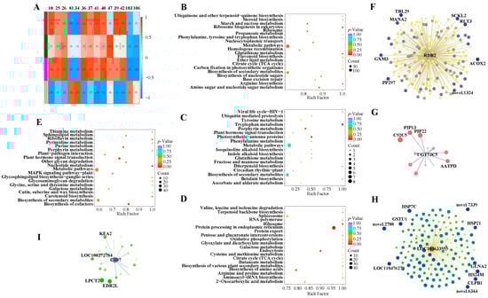 Correlation analysis to mine key pathways and hub genes involved in heat response in sweet corn. Spearman correlation analysis between metabolites and DEGs. The squares with different colors in the first column presented different modules (A). KEGG enrichment analysis of brown (B), dark green (C), magenta (D), and tan (E) modules. Hub genes identified in the brown (F), dark green (G), magenta (H), and tan (I) modules. Log2FC of each connected gene is shown by the thickness of lines and the size of circles; the degree between the hub gene and connected genes is indicated by the color intensity of the circle color. The most connected genes are marked. Abbreviations for genes: RDR2: RNA-dependent RNA polymerase 2; UGT73C5: UDP-glycosyltransferase 73C5; CID7: CTC-interacting domain 7; ACOX2: acyl-coenzyme A oxidase 2; TBL29: trichome birefringence-like 29; RLT3: ringlet 3; SCKL2: fructokinase-like 2; PP297: pentatricopeptide repeat-containing protein; GXM3: glucuronoxylan 4-O-methyltransferase 3; MANA2: probable alpha-mannosidase; C92C5: cytochrome P450 92C5; PIP13: plasma membrane intrinsic protein 1-3; PIP22: plasma membrane intrinsic protein 2-2; AATPD: AAA-ATPase; HS24M: 24.1 kDa heat shock protein; CLPB1: casein lytic proteinase B1; GSTU1: glutathione S-transferase 1; GLNA2: glutamine synthetase root isozyme 2; HSP21: heat shock protein 21; HSP7C: heat shock cognate 70 kDa protein; LPCT2: lysophospholipid acyltransferase 2; EDR2L: enhanced disease resistance 2-like; KEA2: K(+) efflux antiporter 2.