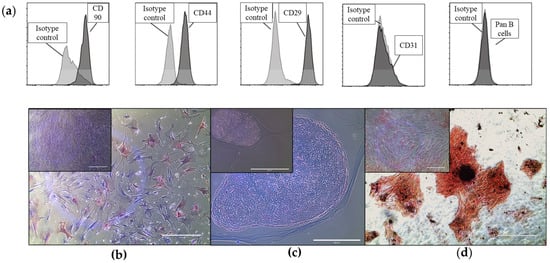 Shows representative images of the characterization of equine bone-marrow-derived cells with trilineage differentiation capacity and canonical surface marker expression of MSCs. (a) Cells were stained with specific cell surface antigens (dark grey plots) or Ig isotype controls (light grey plots) and analyzed by flow cytometry. Cells stained positive for CD90, CD44, and CD29 and negative for CD31 and Pan B, as well as IgG isotype controls. Displayed on the x-axis is either PE or FITC conjugated to one of the previously mentioned antibodies. (b–d) Images show bone-marrow-derived cells differentiating into the adipogenic (b), chondrogenic (c), and osteogenic (d) lineages, stained with Oil red O, Alcian blue, and von Kossa stain, respectively. The corresponding controls (cells grown in an expansion medium) are shown in the insert in the top left corner of each micrograph. Scale bars: 400 µm.