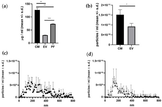 MSCs from 3 equine donors were cultured and the cell-free supernatant was collected and centrifuged to obtain CM, EVs and PF. (a) shows that the protein concentration was significantly higher in the CM fraction than in the EV and PF fractions (** = p = 0.0019 and *** = p = 0.0066, respectively). Moreover, the protein concentration was higher in the PF fraction than in the EV fraction (*** = p = 0.0005). (b) shows that the particle concentration was significantly higher in the CM fraction than in the EV fraction (* = p = 0.0179). (c,d) illustrate the size distribution of the EVs and CM, respectively. The EV fraction contained more particles ≤195 nm, resulting in a more homogeneous size distribution compared with the CM fraction.